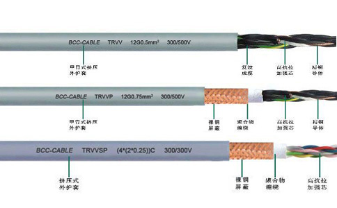 柔性拖鏈電纜型號(hào)中字母所代表的含義分別為:T代表拖鏈電纜;R代表軟電纜;V代表聚氯乙烯(PVC)絕緣;V代表聚氯乙烯(PVC)護(hù)套;S代表雙絞型;P代表屏蔽。